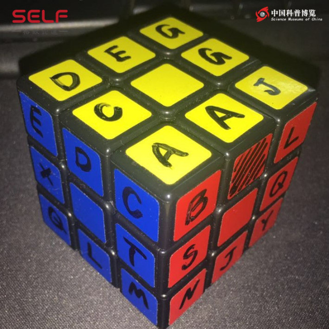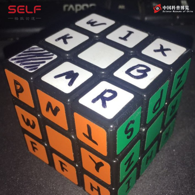 这样一来,一个色彩斑斓的、打乱的魔方就变成了我们眼前所示的18个英文字母。为什么用英文字母?因为英文字母跟我们的汉语拼音是一样的,因为是要记图像,所以最好选择一个立体的名词用于记忆。