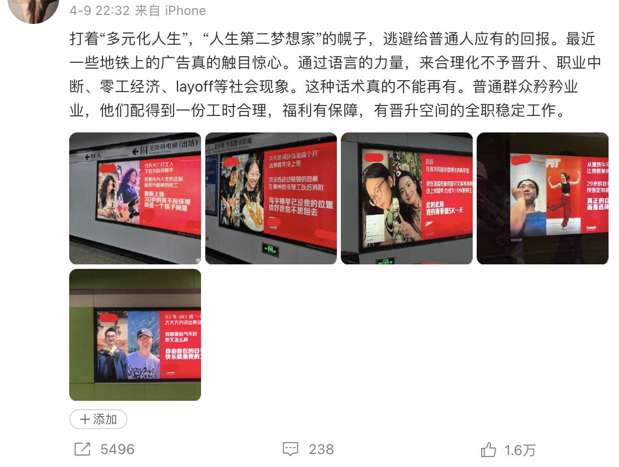 前阵子,一套投放在地铁站的广告激起了网络的舆论水花。广告里,不同主人公发表他们迎来“第二人生”的心声:裸辞两个月的女生去澳洲做洗碗工,渐渐克服了没钱的恐惧,“写字楼没我的位置,恰好我也不想回去”;不被妈妈支持做博主的“全职女儿”,白天复习国考,凌晨拍片修图剪视频,最终在上岸的同时收获了粉丝10w+;93年出生、一年失业三次的985硕士,大方承认自己倒霉,“自由自在的日子里,快乐就是我的工资”......