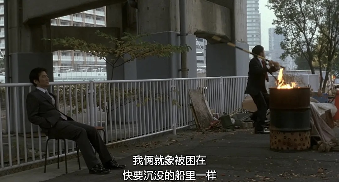 一天他在排队领救济餐时,碰见了老同学黑须。如果说佐佐木是害怕把重压转移给家人而选择隐瞒事实的话,失业两个月的黑须的举动更像他自己都还无法接受这样的结果,转而沉溺在曾经的“辉煌”中苦苦支撑,不愿醒来:他给手机设定了一小时响5次的闹钟,当声音响起时,黑须就佯装接起电话,表现出公事繁忙的样子。