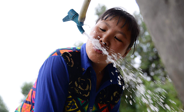 村民张巧英在自家房屋旁边的水管里喝水,水管里的水来自当年黄大发带领村民们兴修的水渠。视觉中国 图