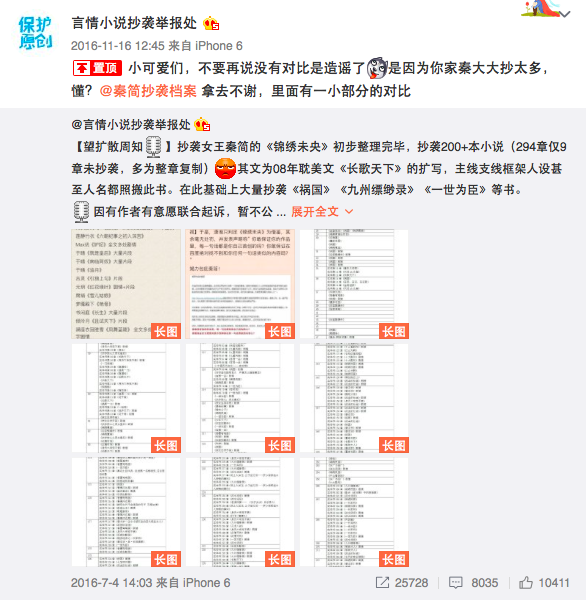此次风波过后,一直有志愿者自发对比、整理《锦绣未央》涉嫌抄袭的情况,并制作了专门用来比对原文和抄袭文的调色盘来进行统计。至2016年7月4日,微博用户“言情小说抄袭举报处”称,“《锦绣未央》初步整理完毕,抄袭200+本小说(294章仅9章未抄袭,多为整章复制)其文为08年耽美文《长歌天下》的扩写,主线支线框架人设甚至人名都照搬此书。在此基础上大量抄袭《祸国》《九州缥缈录》《一世为臣》等书。”