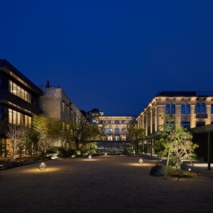 穿过鸭川,再往东山,街道变窄,游客却始终随在左右。路过祇园后转角上坡,尽头便是清水寺,然而我们到了半山腰便转进了一处静谧的广场和草坪,到了这次目的地:京都清水青龙酒店。酒店是由京都清水小学改造而来。校舍为砖造结构,混合西洋比例与日式细节:厚重的檐口搭配纵横的窗框。改造后加入立鼎世酒店联盟成为其中一员,从挂在墙上的旧照片来看,建筑外观形式虽变,肌理却未动。
