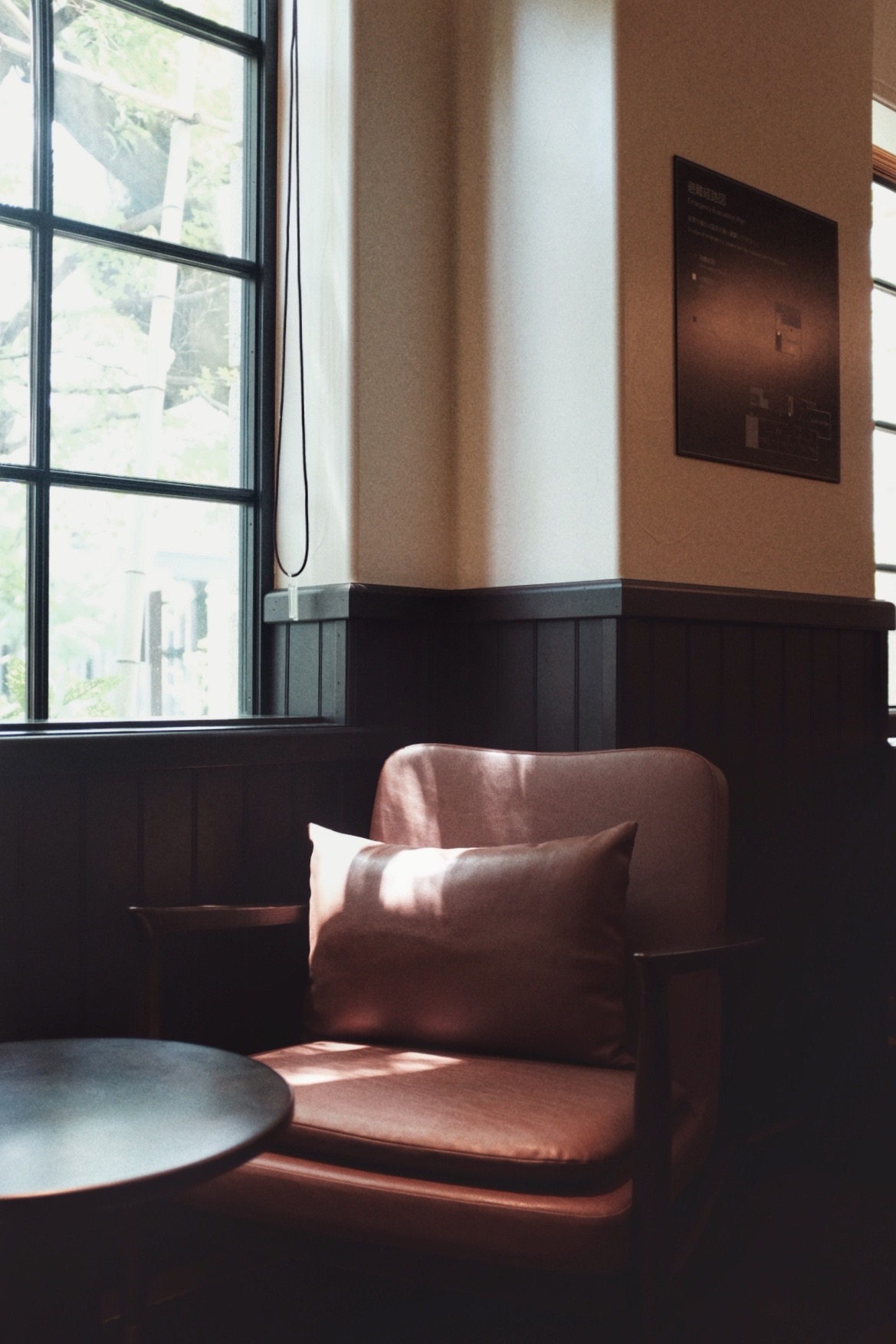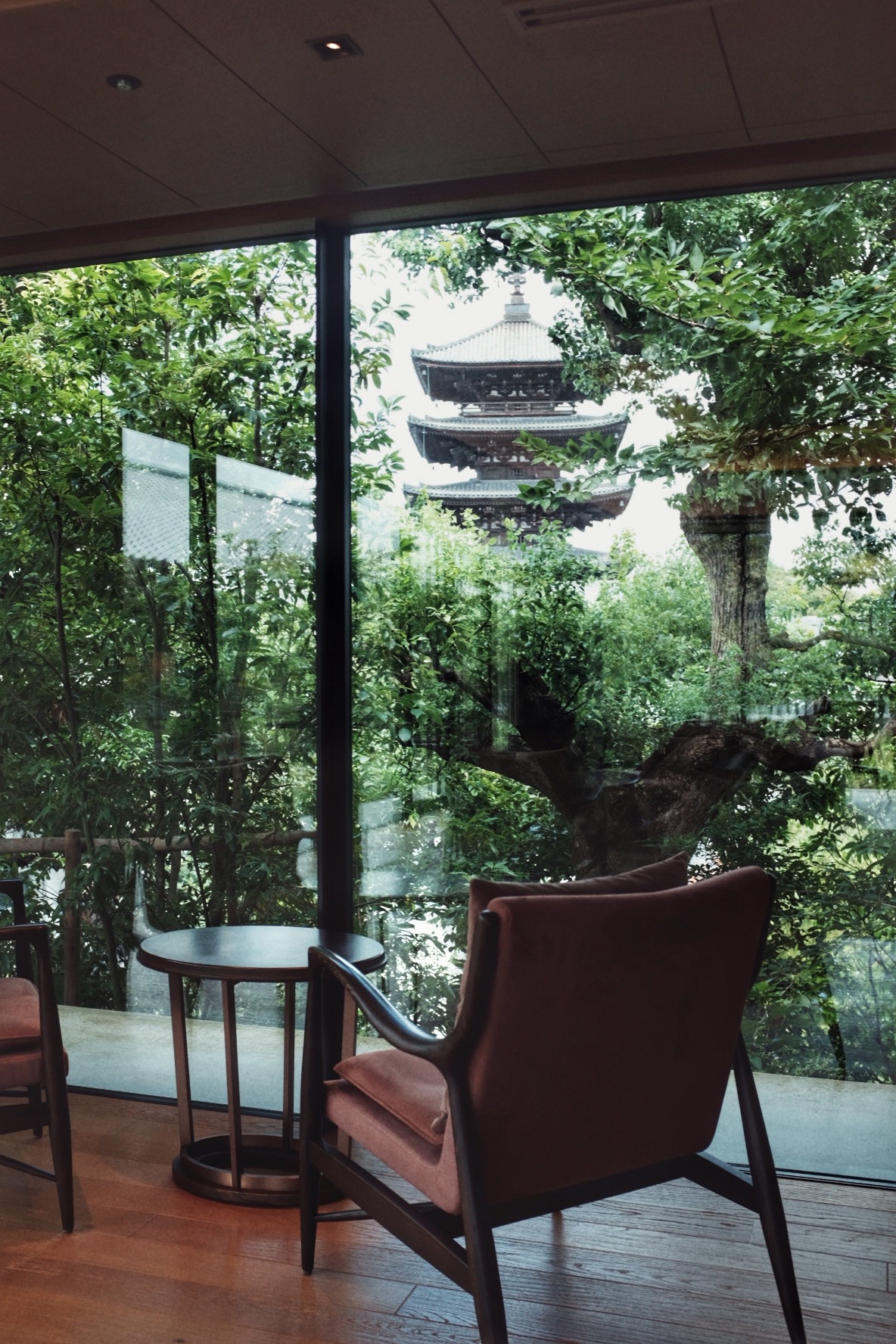 除了主楼空间,两个配套公区也格外出色。其一是全天开放的酒廊(Guest Lounge),位于校舍一侧,藏身于一处展台之后,提供各类咖啡、啤酒、清酒与甜点。沙发与柔光并置,有点像图书馆,又不全是。人少时在此落座,是东山罕见的“安静空间”。透明玻璃窗,屡屡阳光洒入室内,八坂塔就在树荫后若隐若现。