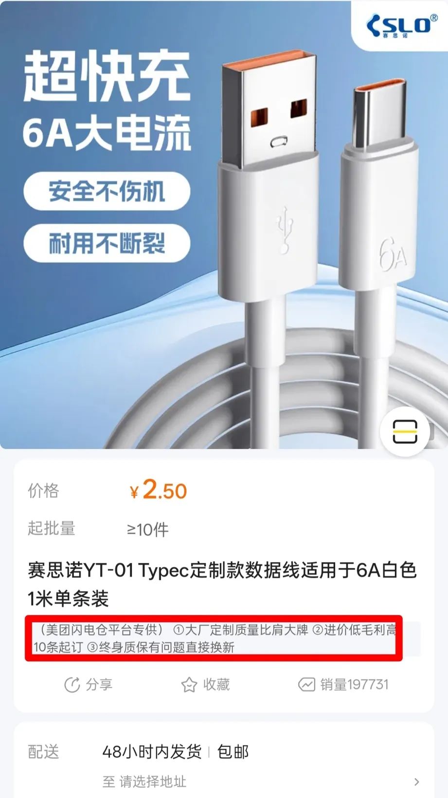 比如深圳一家生产手机配件的品牌“赛思诺”,目前和美团合作推出了闪电仓专供版的Type-C 6A数据线,售价仅2.5元,低于拼多多、抖音电商上部分品牌的价格。