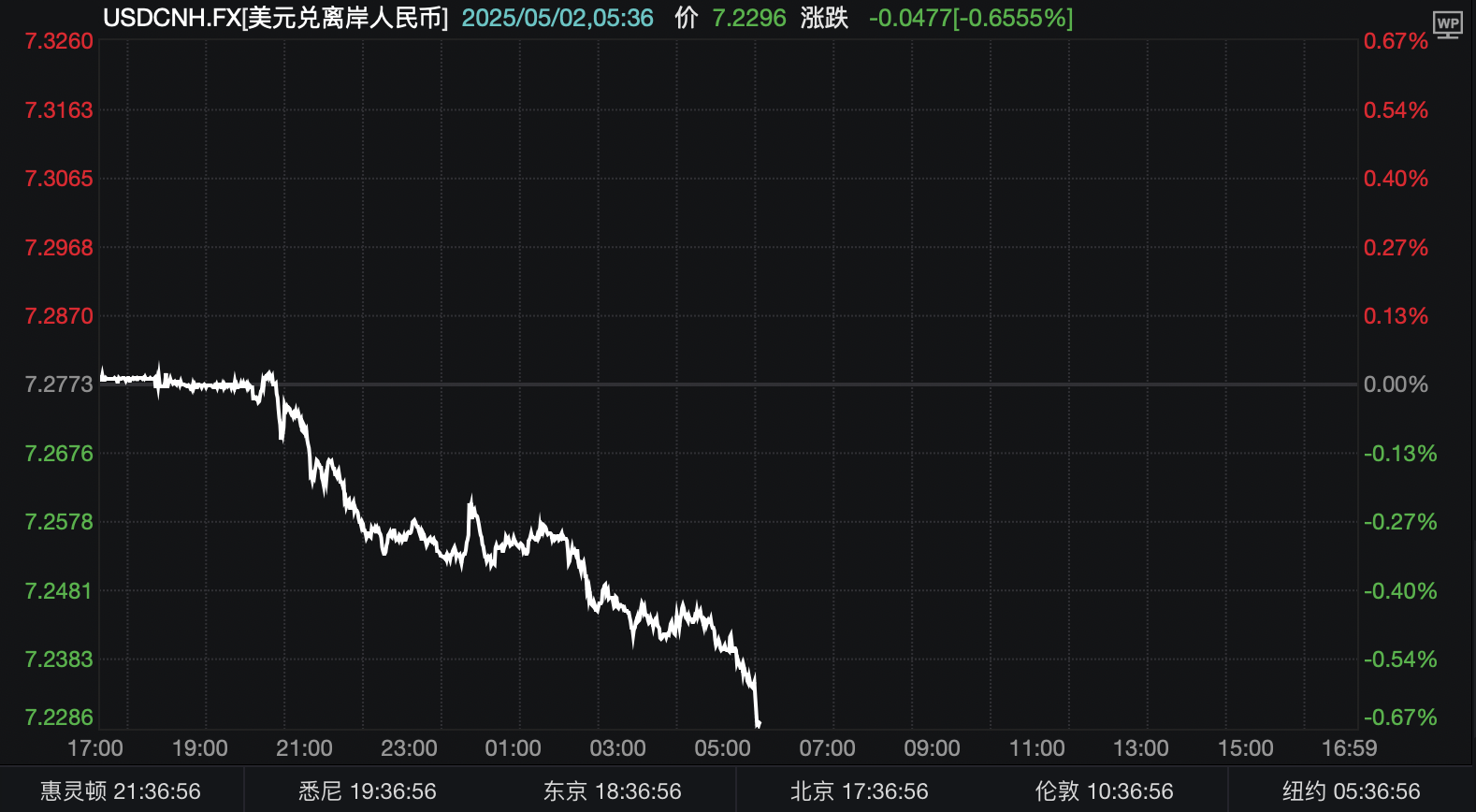 5月2日,离岸人民币兑美元升破7.23,日内涨近500个基点,现报7.2296。