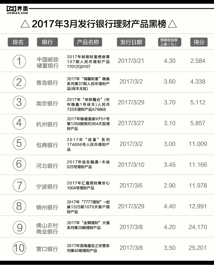 每个月,界面新闻会根据自己制作的一个涵盖数万只理财产品的数据库,对当月理财产品进行评估与排行。该数据库在衡量当期宏观经济、行业水平、银行自身风险、产品属性后选出性价比最高和最低的产品,其挑选范围是全国范围发售的信息披露充分的非结构类理财产品,最终形成当月产品红黑榜。
