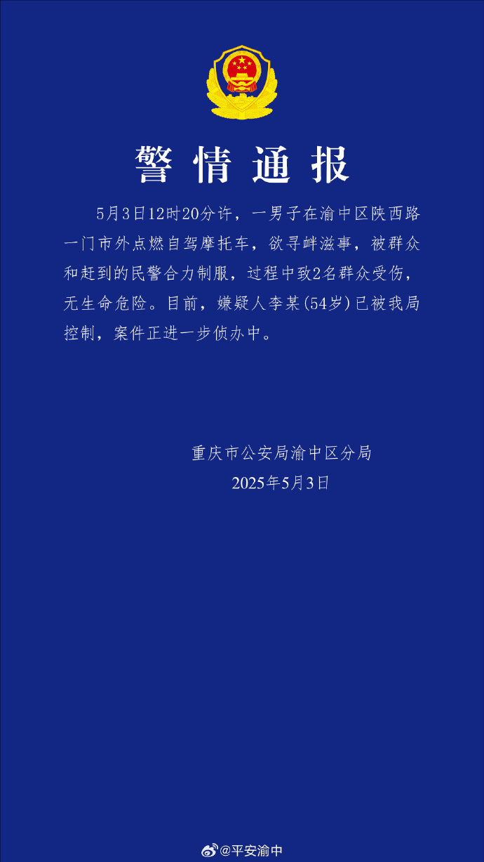 重庆市公安局渝中区分局通报,5月3日12时20分许,一男子在渝中区陕西路一门市外点燃自驾摩托车,欲寻衅滋事,被群众和赶到的民警合力制服,过程中致2名群众受伤,无生命危险。目前,嫌疑人李某(54岁)已被警方控制,案件正进一步侦办中。