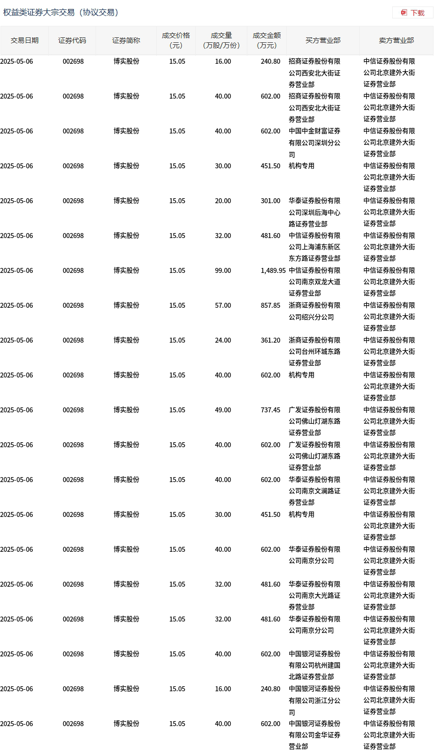 5月6日,博实股份大宗交易成交1000万股,成交额1.51亿元,占当日总成交额的32.93%,成交价15.05元,较市场收盘价16.94元折价11.16%。