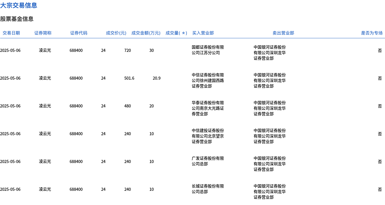 5月6日,凌云光大宗交易成交100.9万股,成交额2421.6万元,占当日总成交额的7.17%,成交价24元,较市场收盘价28.95元折价17.1%。