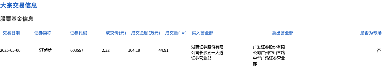 5月6日,ST起步大宗交易成交44.91万股,成交额104.19万元,占当日总成交额的47.88%,成交价2.32元,较市场收盘价2.44元折价4.92%。