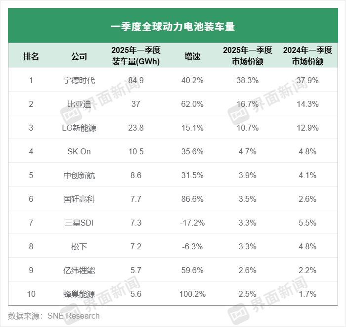 今年一季度,排名全球第四的是韩企SK ON,其排名同比提升两位,取代了去年在此位置的松下。松下今年位次掉至第八。
