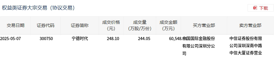 5月7日,宁德时代大宗交易成交244.05万股,成交额6.05亿元,占当日总成交额的7.52%,成交价248.1元,较市场收盘价238.61元溢价3.98%。