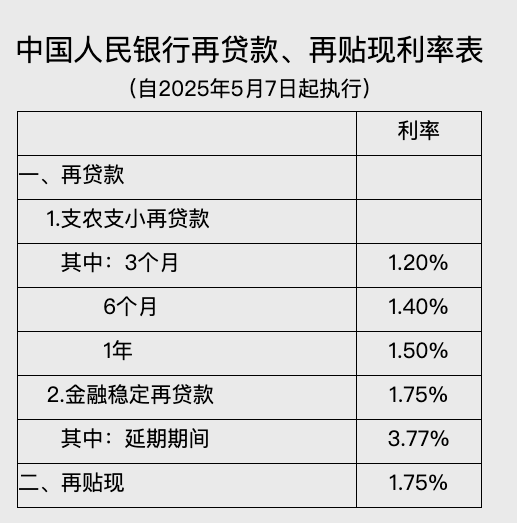 5月7日,中国人民银行公布再贷款、再贴现利率表:3个月、6个月和1年期支农支小再贷款利率分别为1.2%、1.4%和1.5%,金融稳定再贷款利率为1.75%,其中延期期间为3.77%,再贴现利率为1.75%。