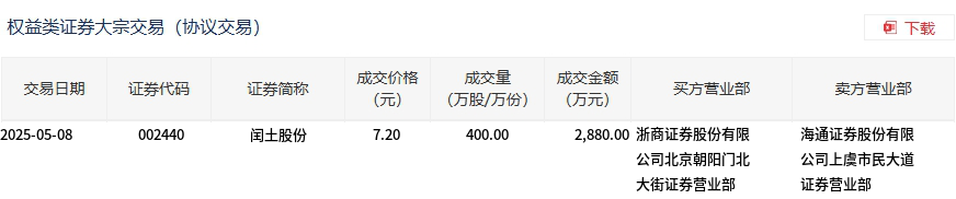 5月8日,闰土股份大宗交易成交400万股,成交额2880万元,占当日总成交额的8.35%,成交价7.2元,较市场收盘价7.57元折价4.89%。