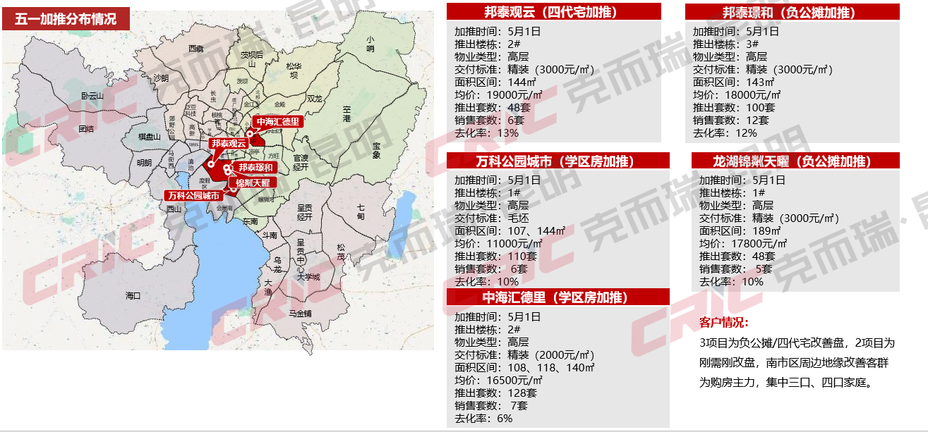 从供应端来看,五一期间昆明共计有5个项目加推,新增供应434套房源,最终认购36套,整体去化率约9%。四代宅、负公摊的改善型项目就占了3个,主要集中在南市区,书包房项目2个。