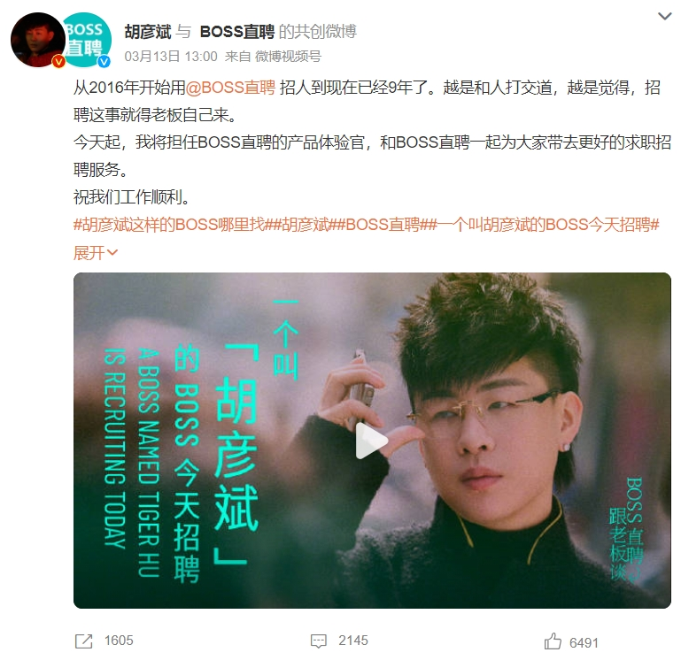 比如胡彦斌在BOSS直聘回复求职者信息的截图走红社交平台后, BOSS直聘趁热打铁邀请其担任 “产品体验官”、拍摄纪录片。透过胡彦斌在咖啡厅、菜市场等轻松环境里用BOSS直聘与求职者交流的场景,BOSS直聘把胡彦斌强调的亲力亲为、平等对话等理念,和自身服务优势结合到了一起,突出其对传统招聘模式的颠覆作用。