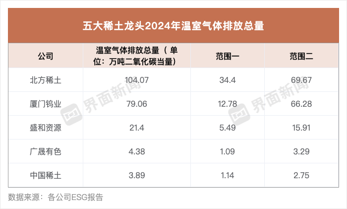 具体看,北方稀土的温室气体排放总量居五家之首,达104.07万吨二氧化碳当量。其次分别是厦门钨业79.06万吨二氧化碳当量、盛和资源21.4万吨二氧化碳当量、广晟有色4.38万吨二氧化碳当量、中国稀土3.89万吨。