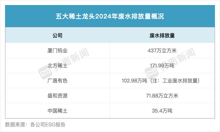 具体看,厦门钨业的废水排放量最高,为437万立方米(约合437万吨)。其次是北方稀土171.99万吨、盛和资源71.88万立方米(约合71.88万吨)、中国稀土35.4万吨。