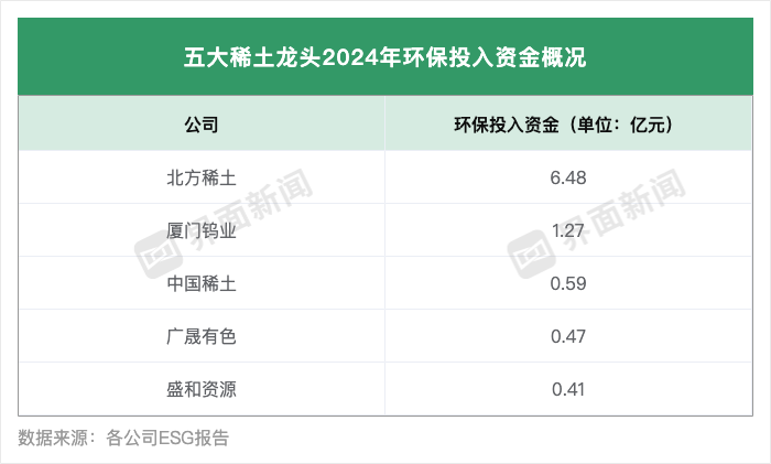 五家公司也均披露了环保投入金额。北方稀土投入金额最高,为6.48亿元,其次分别是厦门钨业1.27亿元、中国稀土0.59亿元、广晟有色0.47亿元、盛和资源0.41亿元。