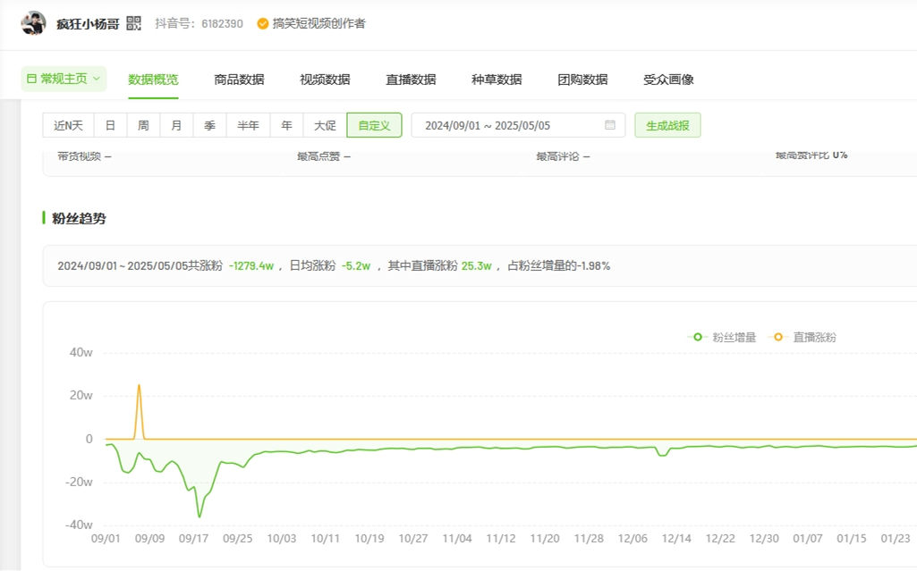 与之同时,疯狂小杨哥的粉丝也呈不断下降趋势。飞瓜数据抖音版显示,2024年9月1日至2025年5月5日,疯狂小杨哥一共掉粉1279万,日均掉粉超5万。对比2024年1月1日至2024年9月1日,疯狂小杨哥总共掉粉不超过300万,可见“香港美诚月饼”事件对疯狂小杨哥的负面影响之大。
