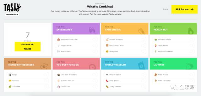 这本食谱与众不同的地方在于“可以为用户实现私人订制”。打开Tasty的订制页面,用户可以从中选择7类自己感兴趣的食物,倘若实在选择困难,可以点击页面上的 “Pick for me”,让系统自动帮忙筛选。
