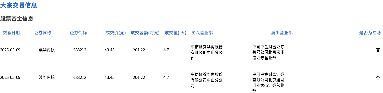 5月9日,澳华内镜大宗交易成交9.4万股,成交额408.44万元,占当日总成交额的7.01%,成交价43.45元,较市场收盘价46.37元折价6.3%。