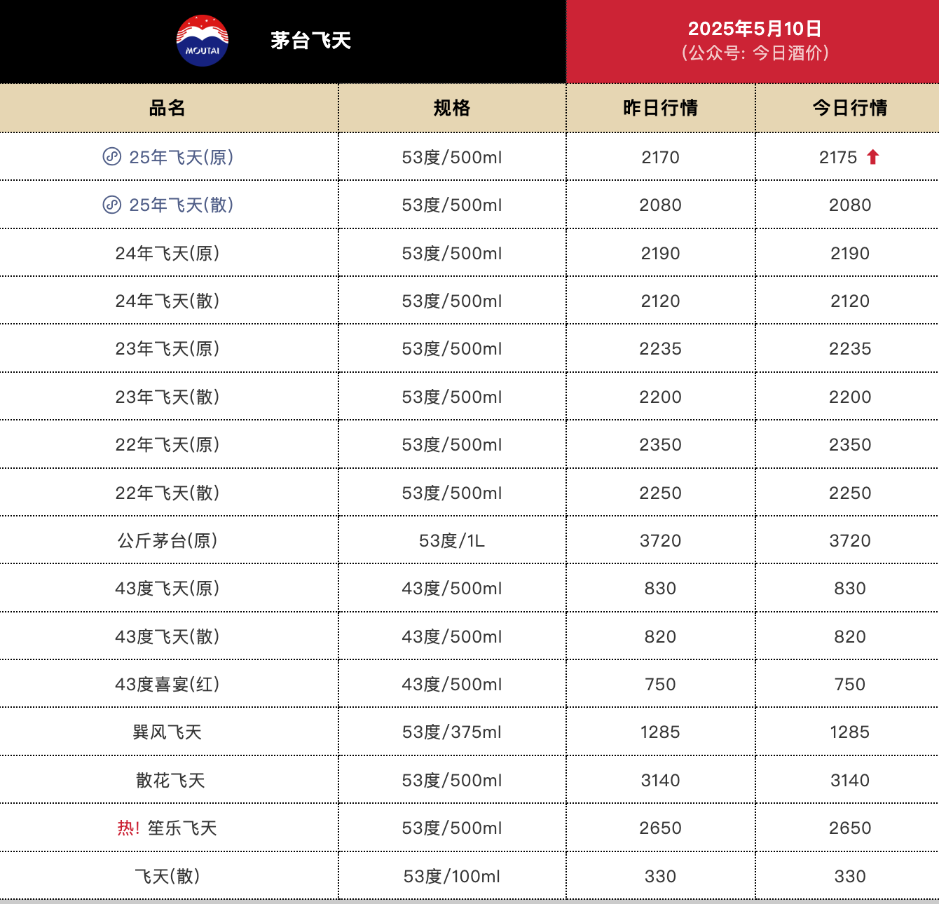 今日酒价披露的批发参考价显示,5月10日,25年飞天茅台原箱较前一日上涨5元,报2175元/瓶;25年飞天茅台散瓶较前一日持平,报2080元/瓶。