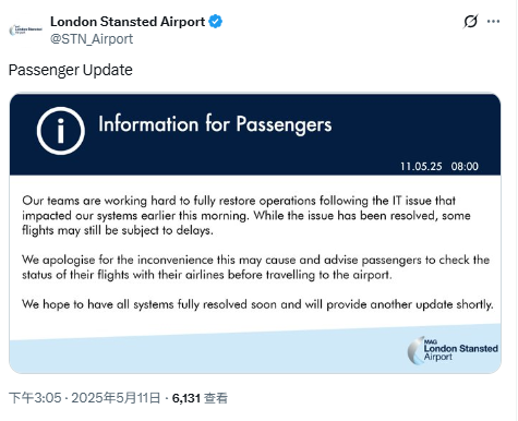 5月11日,伦敦斯坦斯特德机场在社交平台“X”上发布信息称,该机场正在“努力工作”,以全面恢复机场IT故障后的运营。该机场表示,“问题已经解决”,但部分航班可能会延误。