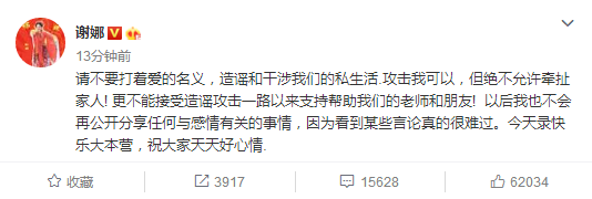 今天,谢娜对于清空事件也首度在微博作出了回应,她在文中称,“以后我也不会再公开分享任何与感情有关的事情,因为看到某些言论真的很难过。”这样的说法使得网友之前的推测更加靠谱。