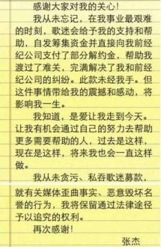 在粉丝的帮助下,张杰成功支付违约金,正式宣布与“上腾娱乐”解约。回归自由身的他在《快乐男声》包装下,知名度和影响力大幅提升。但正当粉丝在为张杰庆祝重生时,他本人却“选择性失忆”的将演唱会一事抛之脑后,甚至还发声明称“款项未经自手”。