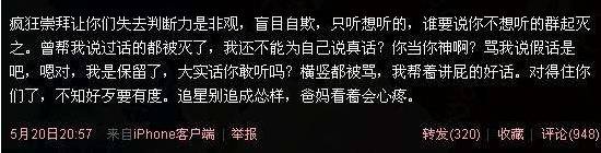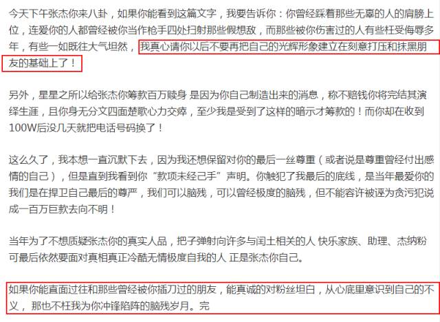 之后,某位老“星星”在兔区公布了当时歌迷集资为张杰赎身的来源始末,称张杰只是一个“软饭”。文章末尾他感叹道,“不要把自己的光辉形象建立在刻意打压和抹黑朋友的基础上了,希望能真诚对待粉丝,从心底意识到自己的不义,也不枉我为你冲锋陷阵的脑残岁月。”