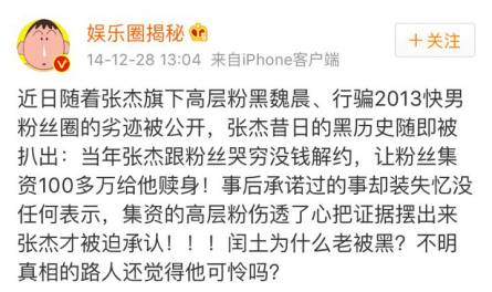 但让张杰没料到的是,“核磁共振”一事不仅引发大众嘲讽,更成为网友对张杰往事爆料的导火索。5月2日,网友“公马333333”在天涯论坛上发帖说,“突然发现帖子里有很多闰土的前粉丝一个个都在控诉闰土的极品事迹。其中最让我震惊的就是闰土和前经纪公司的解约费竟然是粉丝募捐的,而且是整整100万啊!最最极品的是闰土此后就一直装失忆对此事绝口不提,真的没人来818吗?”消息一出,各种爆料立即在网络上层出不穷。