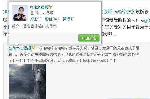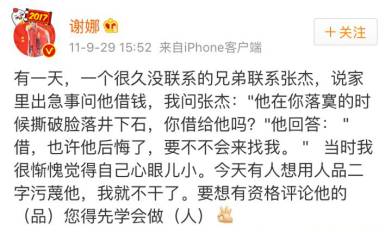 就在苟伟发微博的第二天,谢娜紧随其后更新微博,以一则小故事对苟伟冷嘲热讽了一番,文中称,“今天有人想用人品二字污蔑他,我就不干了。要想有资格评论他的(品),您得先学会做(人)。”