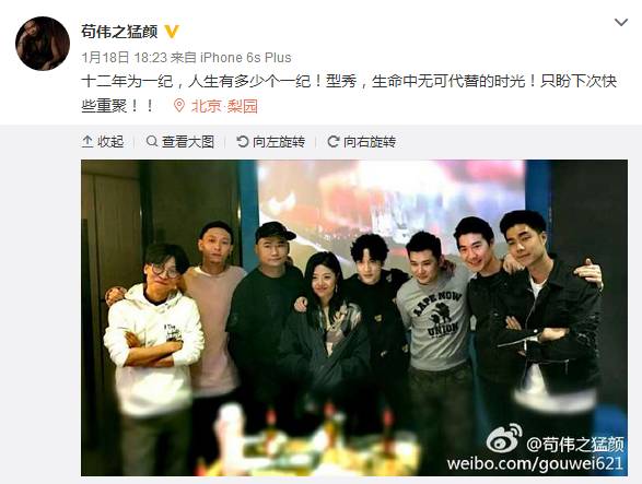 今年1月,苟伟在微博发了一张《我型我秀》12年的聚会照片,薛之谦、王啸坤、俞思远,苟伟、马海生,袁成杰、丁爽 、吴斌,这些当年出现在“型秀”舞台的选手们统统现身,苟伟配文称,“十二年为一纪,人生有多少个一纪!型秀,生命中无可代替的时光!只盼下次重聚”,网友在感叹时光如白驹过隙时,也惊讶的发现,“型秀”老友重聚,却唯独少了张杰。