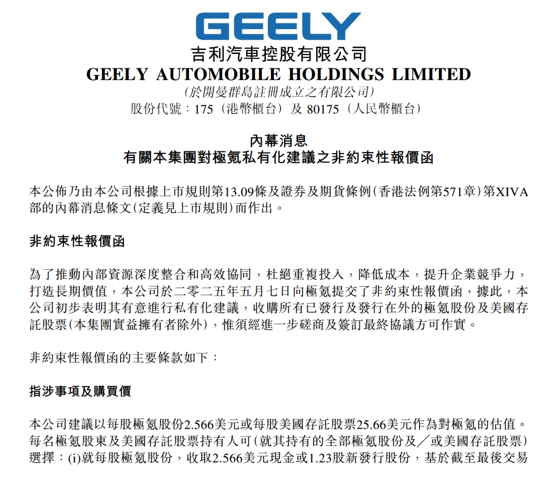 5月7日,吉利汽车发布公告称,已向极氪提交非约束性报价函,计划以每股2.57美元或每股美国存托股票25.66美元的价格,收购其全部已发行股份,这一报价较极氪最后交易日收盘价溢价13.6%。
