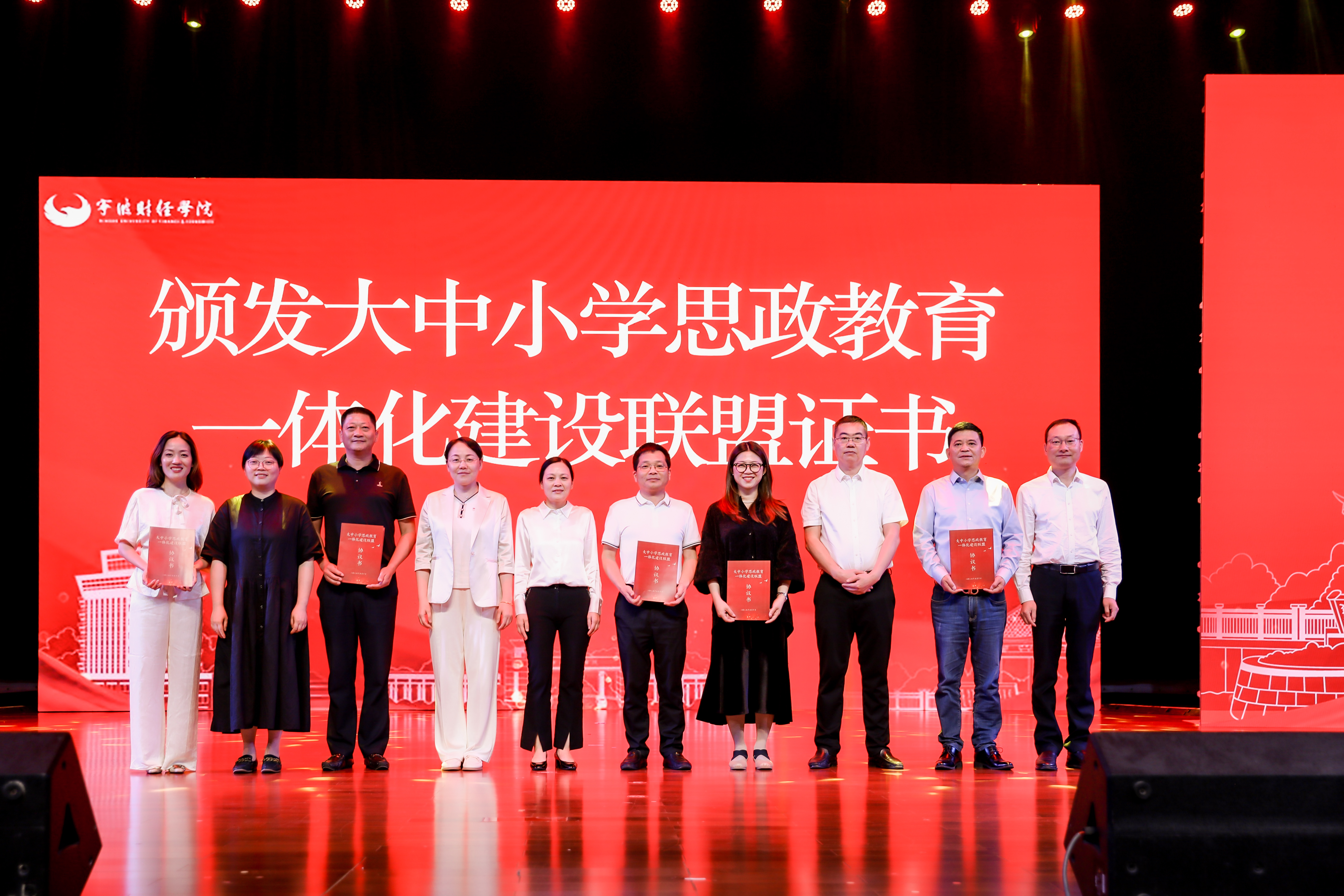 当日,宁波财经学院与宁波前湾新区科学初级中学、宁波前湾新区初级中学、庵东镇初级中学、庵东镇中心小学、前湾新区观塘湖小学,以及慈溪市小叶子艺校志愿服务队、宁波前湾新区彩虹湾社会工作服务中心等社会单位正式结成大中小学思政教育一体化建设联盟。该联盟立足新时代青少年思想成长特性,致力于打破教育学段与学校社会壁垒,凝聚教育智慧与育人力量,创新思政教育内容及形式,拓展一体化内涵外延,并积极开展同场域、共主题思政课堂社会场景实践。