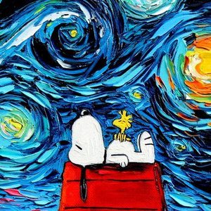 于是,《梵高从未见过(Van Gogh Never)》系列就诞生啦。从仰望旋转的星空的史努比,到色彩更斑斓的超级马里奥。这些画作都可以在Aja的Etsy商店买到,有多重尺寸可供选择,最小的尺寸是5*5英寸一幅,售价8美元。