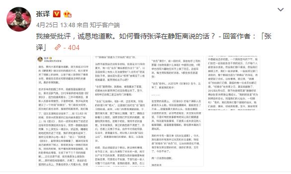 今日(4月25日)下午,张译针对此事在知乎与微博给出回应,为自己在《非常静距离》时提到的“妖精会”致歉。张译解释称,成立“妖精会”没有他意,绝不是传闻中所说的“侮辱女性”。