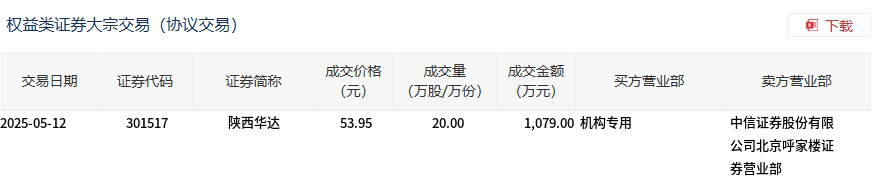 5月12日,陕西华达大宗交易成交20万股,成交额1079万元,占当日总成交额的2.42%,成交价53.95元,较市场收盘价54.66元折价1.3%。
