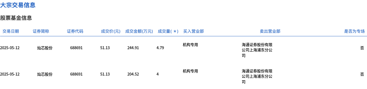 5月12日,灿芯股份大宗交易成交8.79万股,成交额449.43万元,占当日总成交额的2.2%,成交价51.13元,较市场收盘价58.1元折价12%。