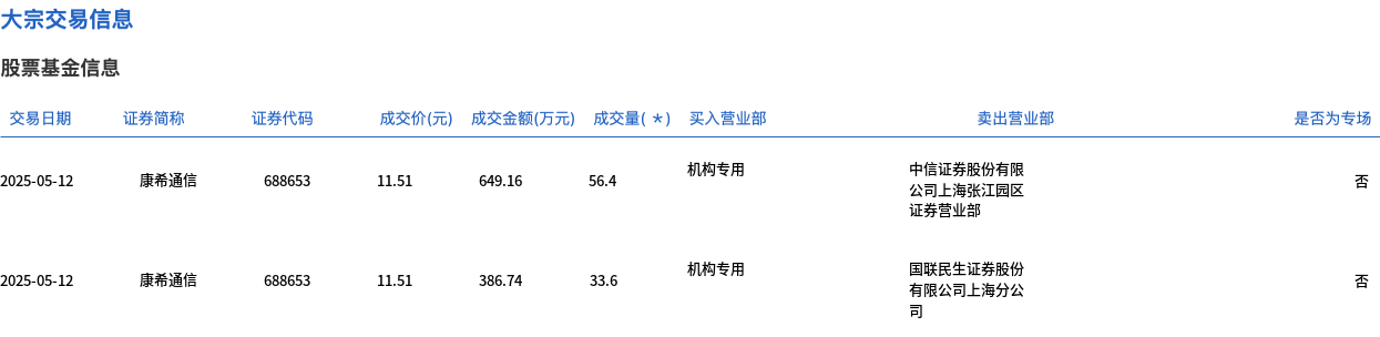 5月12日,康希通信大宗交易成交90万股,成交额1035.9万元,占当日总成交额的11.79%,成交价11.51元,较市场收盘价11.69元折价1.54%。