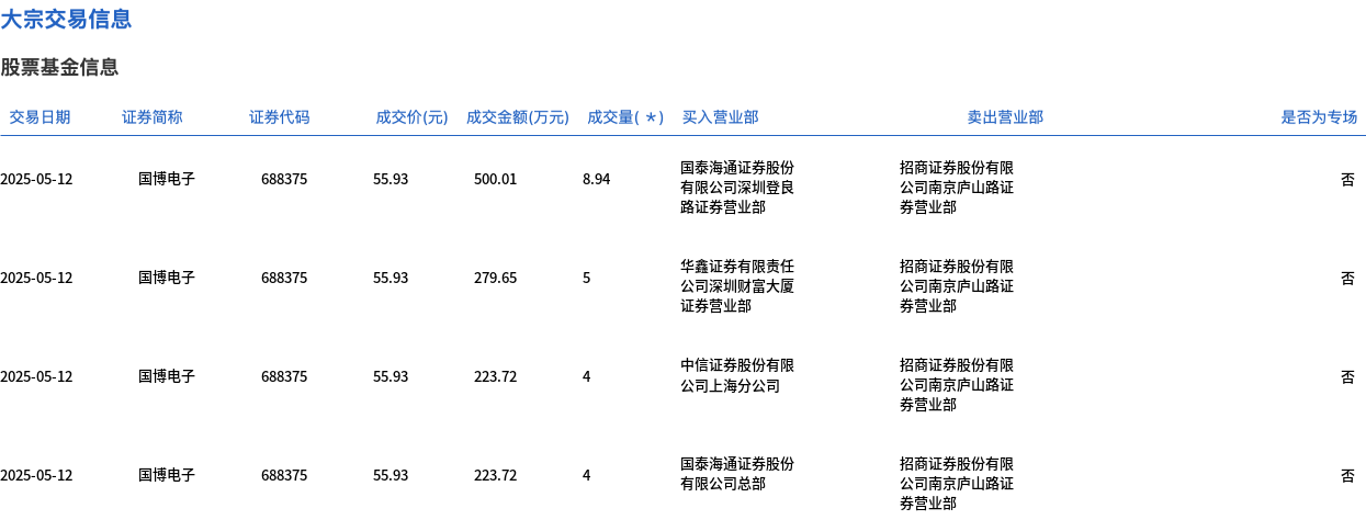 5月12日,国博电子大宗交易成交21.94万股,成交额1227.1万元,占当日总成交额的1.58%,成交价55.93元,较市场收盘价62.45元折价10.44%。