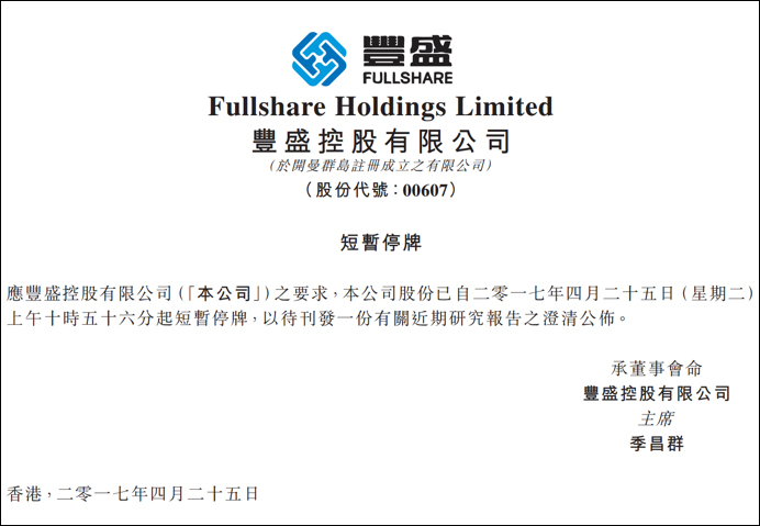 4月25日,美国做空机构格劳克斯(Glaucus Research)发表研报,看空在港上市的内地开发商丰盛控股(0607.HK)。丰盛控股股价在早盘盘中出现断崖式下跌,在不到半个小时内急跌11.89%,10时56分丰盛控股紧急停牌,以等待刊发澄清公告。