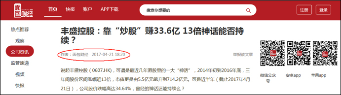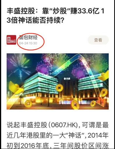 实际上,早在4月21日,面包财经网站上就发布过题为《丰盛控股:靠“炒股”赚33.6亿 13倍神话能否持续?》的文章,明确指出该公司过去几年市值膨胀,但公司主营业务并未给公司带来足够利润。我们发现,公司股权交易频繁,净利润主要来自于非经常项目损益中的投资收益,而非主营业务。2016年度,公司金融工具公允价值变动收益高达33.61亿元,在文中提示投资者,这一情况需要关注。