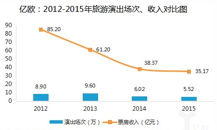 虽然宋城业绩一直在稳步提升,但对于旅游演艺市场来说,这几年的发展简直就是灾难。据中国演出行业协会的报告显示, 2014年旅游演出6.02万场,票房收入38.37亿元,场次与票房收入均比2013年下降37.30%,2015年也不乐观,较2014年的6.02万场下降了8.31%,票房收入35.17亿元,下降了8.34%。