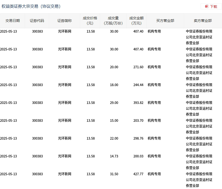 5月13日,光环新网大宗交易成交210.23万股,成交额2854.92万元,占当日总成交额的2.09%,成交价13.58元,较市场收盘价14.92元折价8.98%。