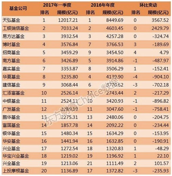 根据东方财富Choice数据统计,截至一季末,天弘基金以1.2万亿的资产管理规模继续稳坐行业老大交椅,工银瑞信、易方达基金分别以7033亿、3993亿元位列第二、第三。