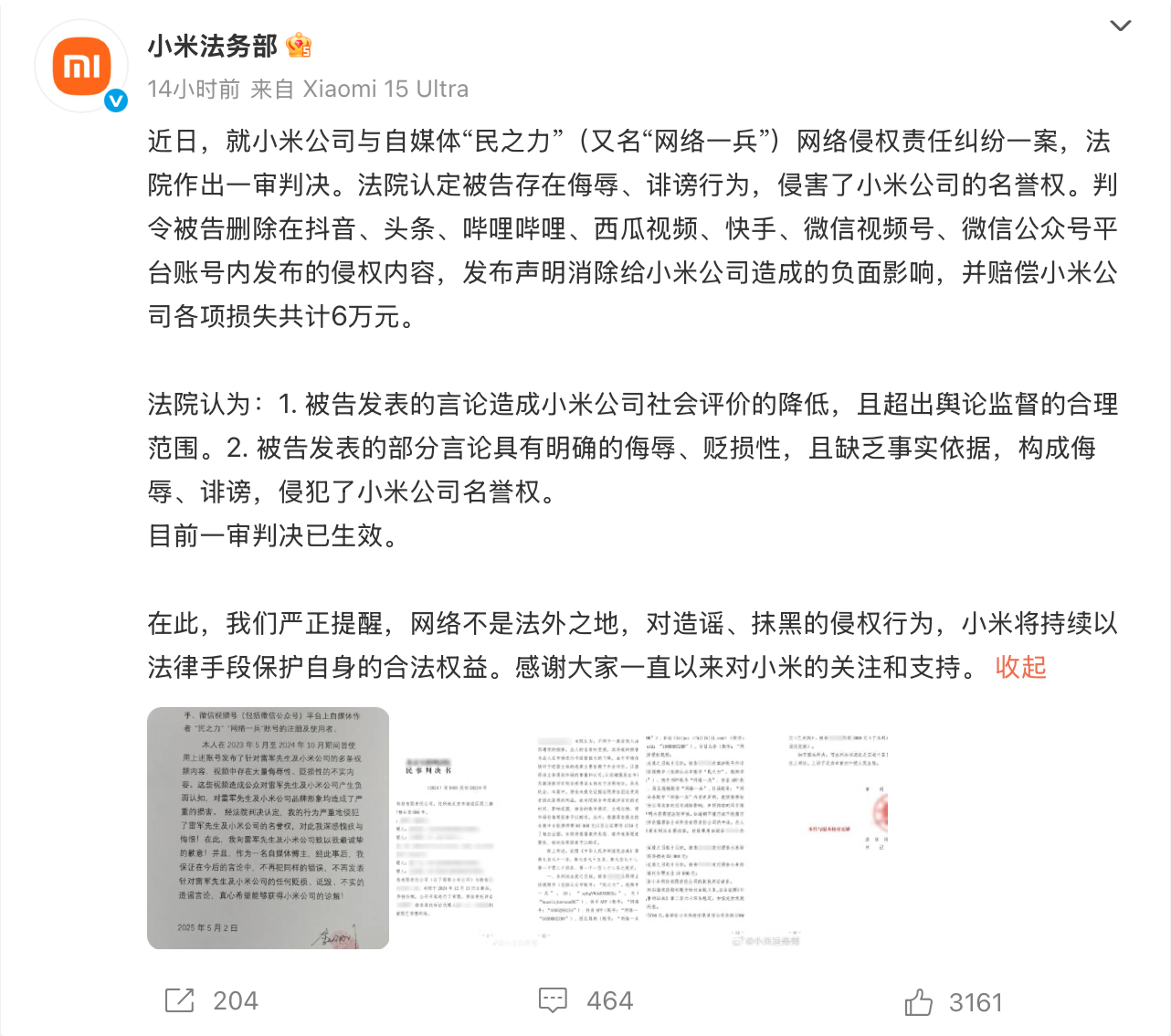 5月14日傍晚,小米法务部在社交平台发文称,近日,就小米公司与自媒体“民之力”(又名“网络一兵”)网络侵权责任纠纷一案,法院作出一审判决。法院认定被告存在侮辱、诽谤行为,侵害了小米公司的名誉权。判令被告删除在抖音、头条、哔哩哔哩、西瓜视频、快手、微信视频号、微信公众号平台账号内发布的侵权内容,发布声明消除给小米公司造成的负面影响,并赔偿小米公司各项损失共计6万元。