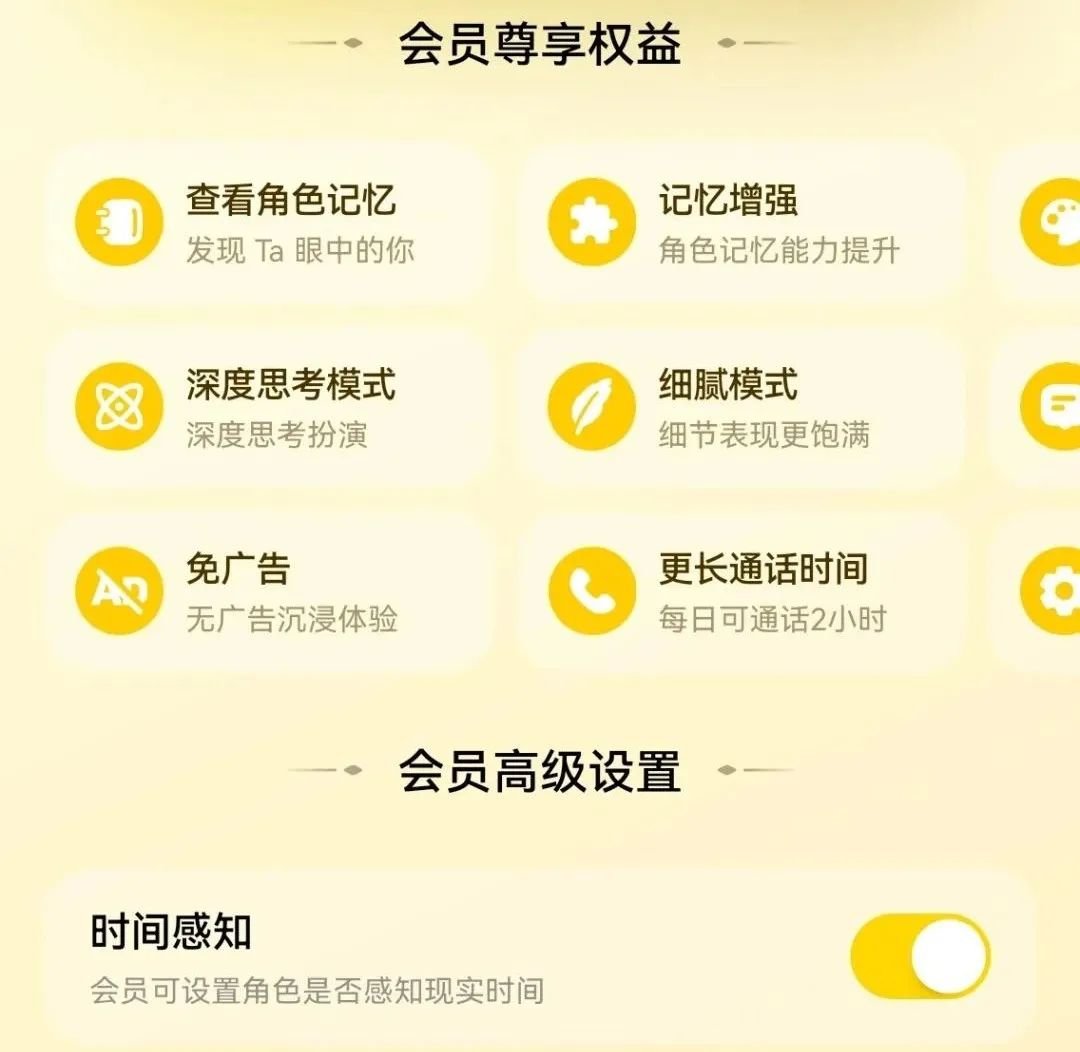 这些AI陪伴应用的相同之处在于,应用内都设有氪金项目,比如用户可以通过卡通会员付费解锁免广告、增加对话时长/次数等高级服务。