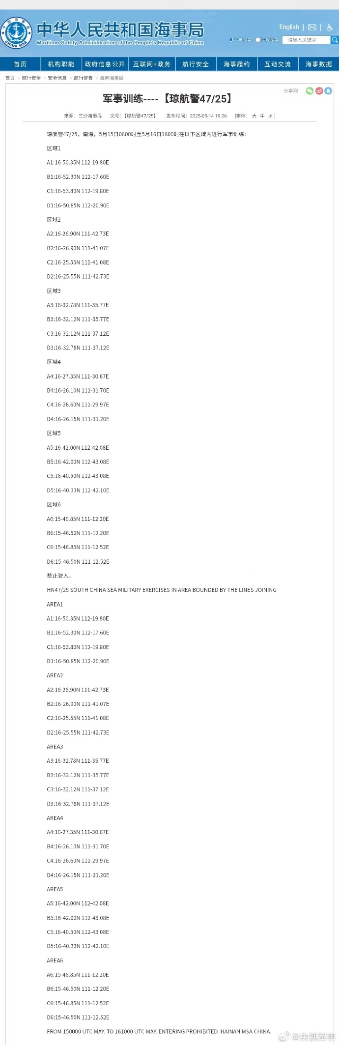 航行警告:南海海域军事训练